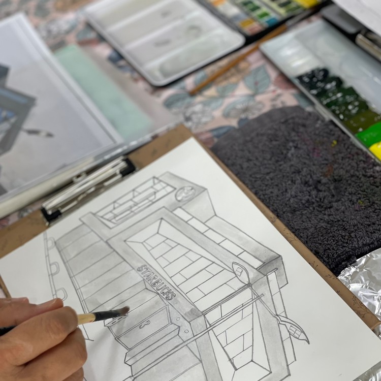 | 심화반 | 200,000 8회 / 회당 약 2hr | 1. 카페 건물 연필 스케치 (창문,가로등, 기둥, 나무, 상호, 입체감 표현). 2. 카페 건물 펜 터치 (수성 만녈필). 3. 명암, 그림자, 채색. 4. 카페 건물 수채물감 채색/ 작품1 5. 인사동 상점 연필 스케치. (다양한 구도의 건물 소실점 이해와 간판, 한옥 지붕, 전등, 판매대, 판매 물건 등 복잡한 구도를 입체감 있게 표현). 6. 상점 건물 펜 터치 (수성, 유성). 7. 수성 만년필 명암, 그림자, 채색. 8. 상점 건물 수채물감 채색/ 작품2 | 강사제공 : 프린트, 스케치북